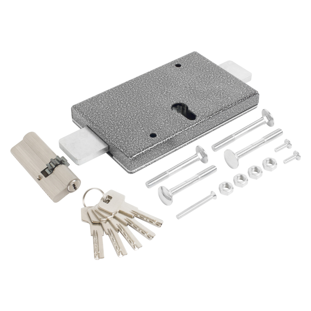 Замок накладной для металлических дверей. Может использоваться для гаражей. Взаимозаменяем с замками ЗГЦ и ЗНЦ производства "Сельмаш" г. Киров Максимальная толщина двери – 50 мм. Комплектация: Корпус замка – 1 шт; Механизм цилиндровый с ключами – 1шт; Накладка наружная – 1 шт. Болт М8 – 4 шт; Гайка М8 – 4 шт; Крышка – 1 шт; Засов – 1 шт; Винт для крепления механизма цилиндрового – 1 шт; Винт для крепления крышки - 2 шт. Инструкция – 1 шт.